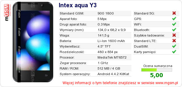 Dane telefonu Intex aqua Y3 na Twojej stronie