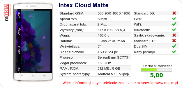 Masz swoją stronę? Chcesz wstawić gdzieś informacje o podstawowych danych telefonu Intex Cloud Matte ? To bardzo proste. Możesz pobrać obrazek, lub skopiować i wkleić na stronę poniższy kod:Wklejenie tego kodu spowoduje wyświetlenie poniższego obrazka: