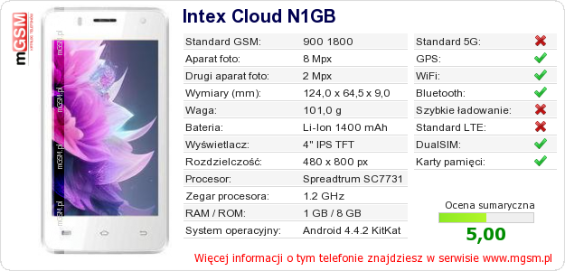 Dane telefonu Intex Cloud N1GB na Twojej stronie