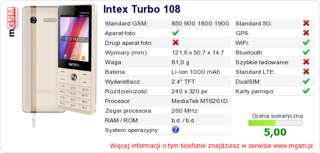 Dane telefonu Intex Turbo 108 na Twojej stronie