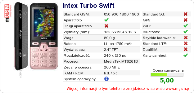 Dane telefonu Intex Turbo Swift na Twojej stronie