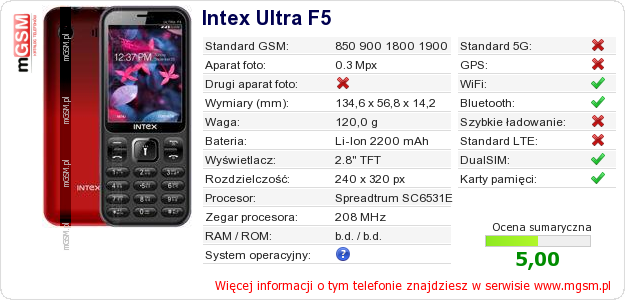 Dane telefonu Intex Ultra F5 na Twojej stronie