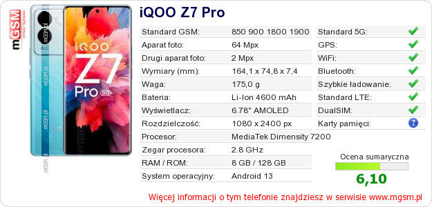 Dane telefonu iQOO Z7 Pro na Twojej stronie