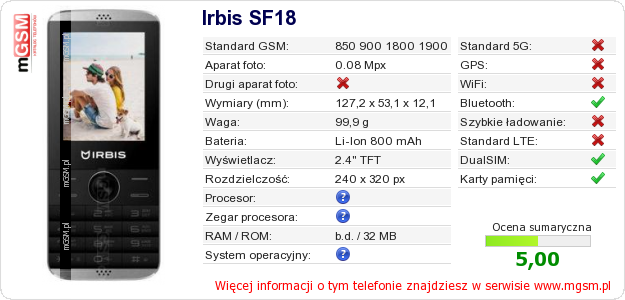 Dane telefonu Irbis SF18 na Twojej stronie