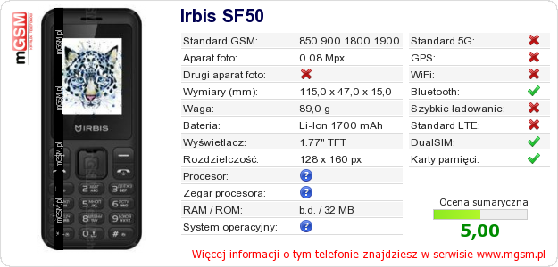 Dane telefonu Irbis SF50 na Twojej stronie
