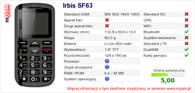 Dane telefonu Irbis SF63 na Twojej stronie
