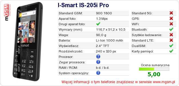 Dane telefonu I-Smart IS-205i Pro na Twojej stronie