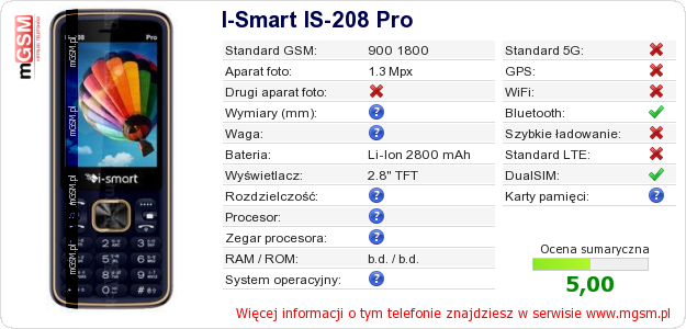 Dane telefonu I-Smart IS-208 Pro na Twojej stronie