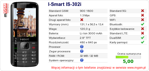 Dane telefonu I-Smart IS-302i na Twojej stronie