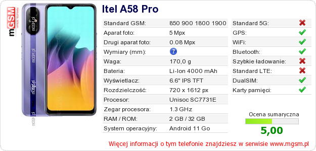 Dane telefonu Itel A58 Pro na Twojej stronie