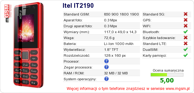 Dane telefonu Itel IT2190 na Twojej stronie