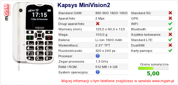 Dane telefonu Kapsys MiniVision2 na Twojej stronie