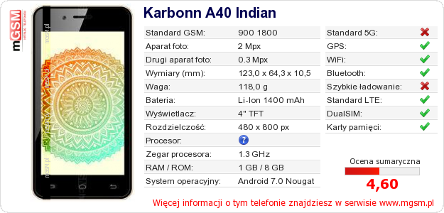 Masz swoją stronę? Chcesz wstawić gdzieś informacje o podstawowych danych telefonu Karbonn A40 Indian ? To bardzo proste. Możesz pobrać obrazek, lub skopiować i wkleić na stronę poniższy kod:Wklejenie tego kodu spowoduje wyświetlenie poniższego obrazka: