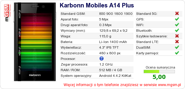 Dane telefonu Karbonn Mobiles A14 Plus na Twojej stronie