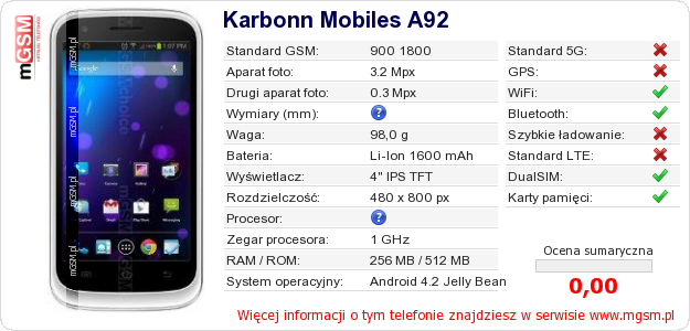 Dane telefonu Karbonn Mobiles A92 na Twojej stronie