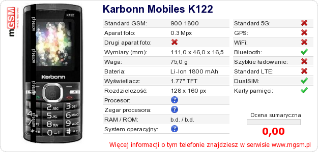 Dane telefonu Karbonn Mobiles K122 na Twojej stronie