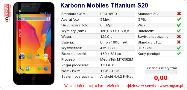 Dane telefonu Karbonn Mobiles Titanium S20 na Twojej stronie