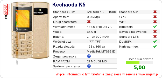 Dane telefonu Kechaoda K5 na Twojej stronie