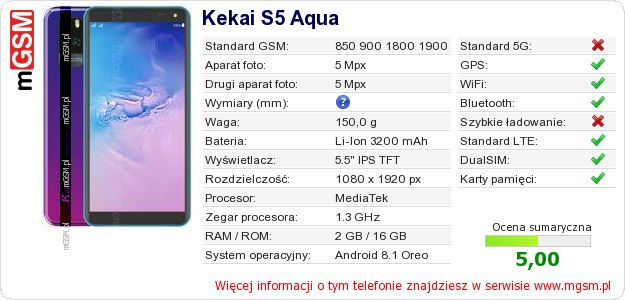 Dane telefonu Kekai S5 Aqua na Twojej stronie