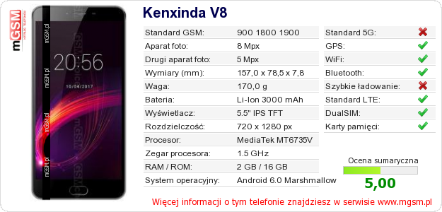Dane telefonu Kenxinda V8 na Twojej stronie