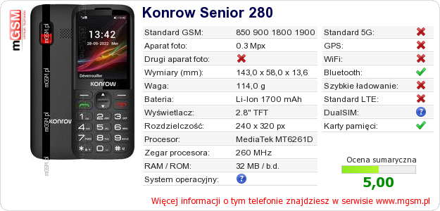 Dane telefonu Konrow Senior 280 na Twojej stronie