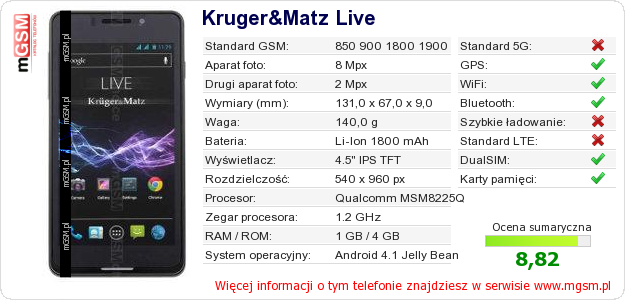 Dane telefonu Kruger&Matz Live na Twojej stronie