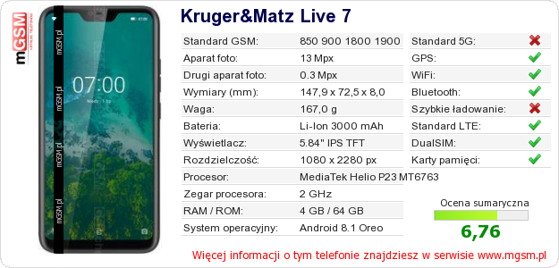 Dane telefonu Kruger&Matz Live 7 na Twojej stronie