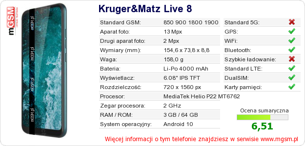 Dane telefonu Kruger&Matz Live 8 na Twojej stronie