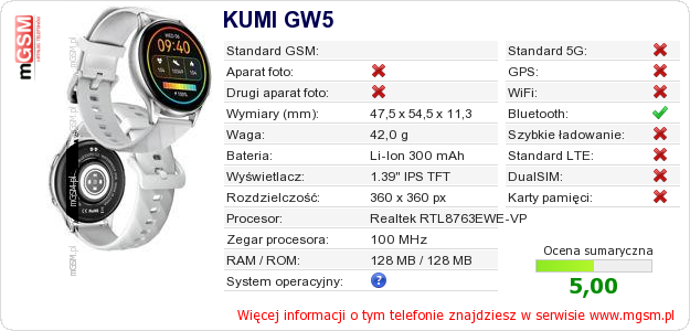 Dane telefonu KUMI GW5 na Twojej stronie