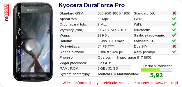 Dane telefonu Kyocera DuraForce Pro na Twojej stronie