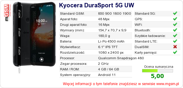 Dane telefonu Kyocera DuraSport 5G UW na Twojej stronie