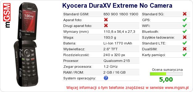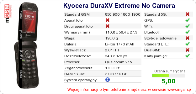 Dane telefonu Kyocera DuraXV Extreme No Camera na Twojej stronie