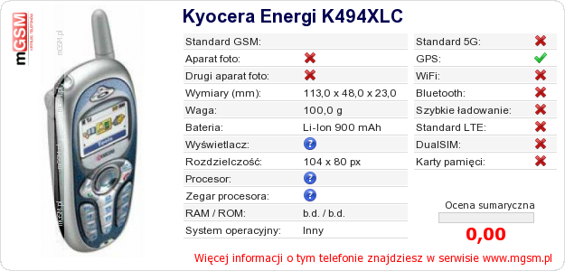 Dane telefonu Kyocera Energi K494XLC na Twojej stronie