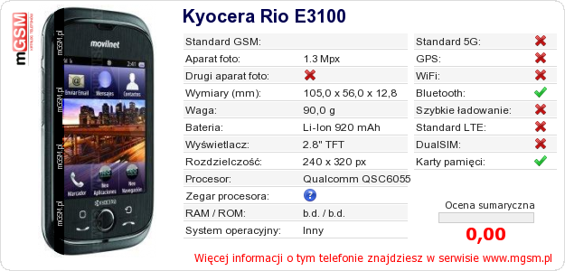Dane telefonu Kyocera Rio E3100 na Twojej stronie
