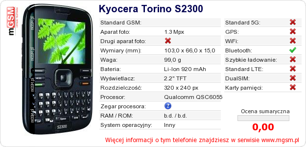 Dane telefonu Kyocera Torino S2300 na Twojej stronie