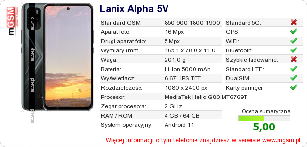 Dane telefonu Lanix Alpha 5V na Twojej stronie