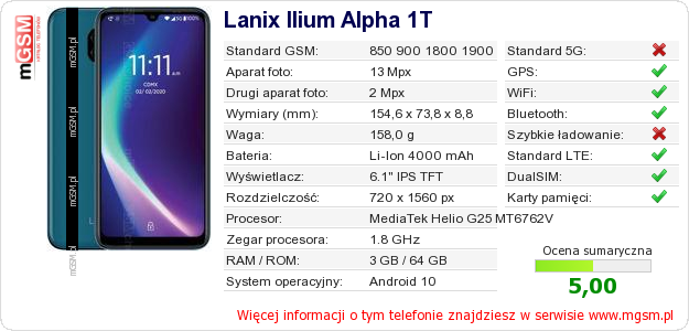 Dane telefonu Lanix Ilium Alpha 1T na Twojej stronie