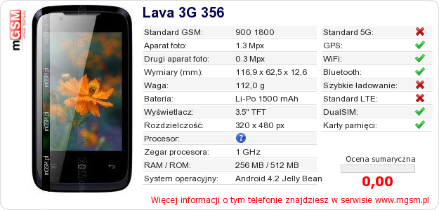 Dane telefonu Lava 3G 356 na Twojej stronie
