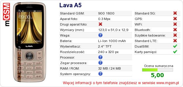 Dane telefonu Lava A5 na Twojej stronie
