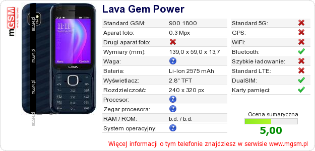 Dane telefonu Lava Gem Power na Twojej stronie