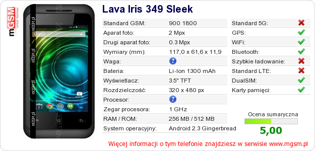 Dane telefonu Lava Iris 349 Sleek na Twojej stronie
