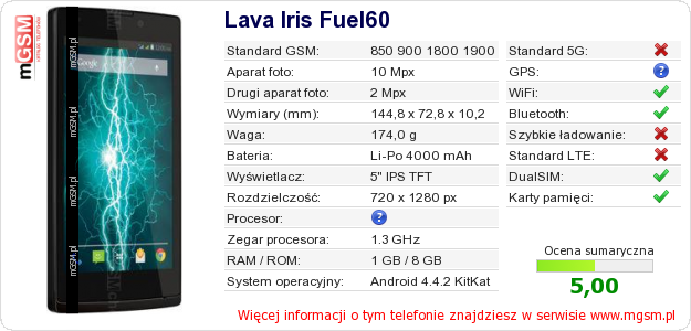 Dane telefonu Lava Iris Fuel60 na Twojej stronie