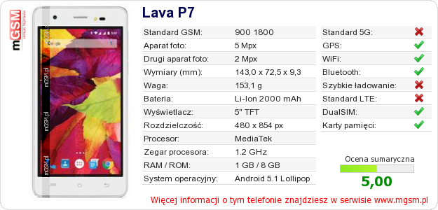 Dane telefonu Lava P7 na Twojej stronie
