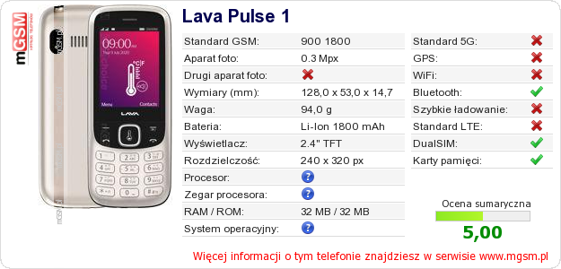 Dane telefonu Lava Pulse 1 na Twojej stronie