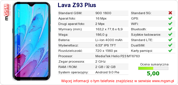 Dane telefonu Lava Z93 Plus na Twojej stronie