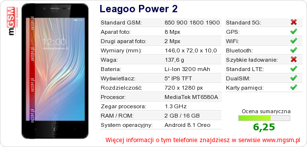 Dane telefonu Leagoo Power 2 na Twojej stronie