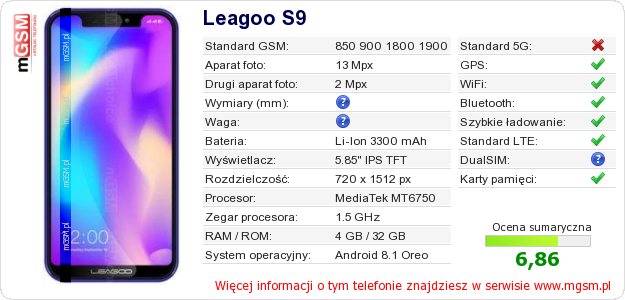 Dane telefonu Leagoo S9 na Twojej stronie