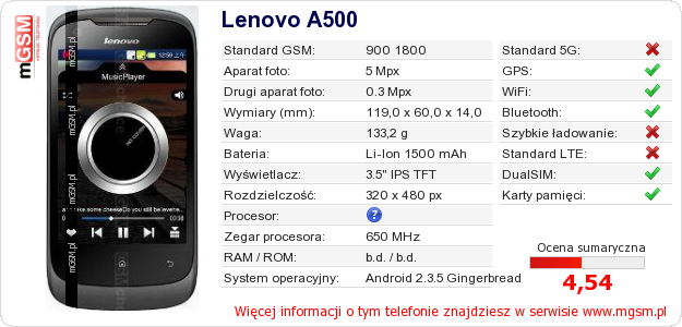 Dane telefonu Lenovo A500 na Twojej stronie