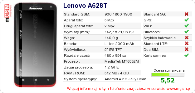 Dane telefonu Lenovo A628T na Twojej stronie