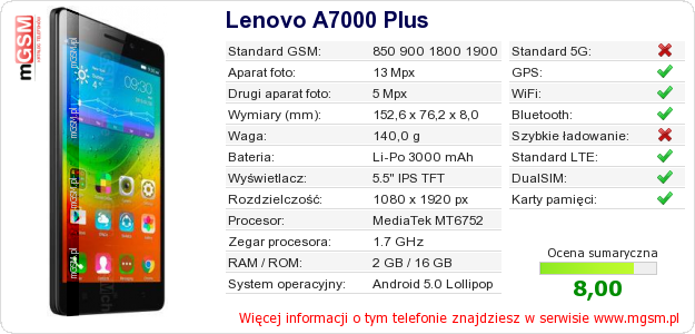 Dane telefonu Lenovo A7000 Plus na Twojej stronie